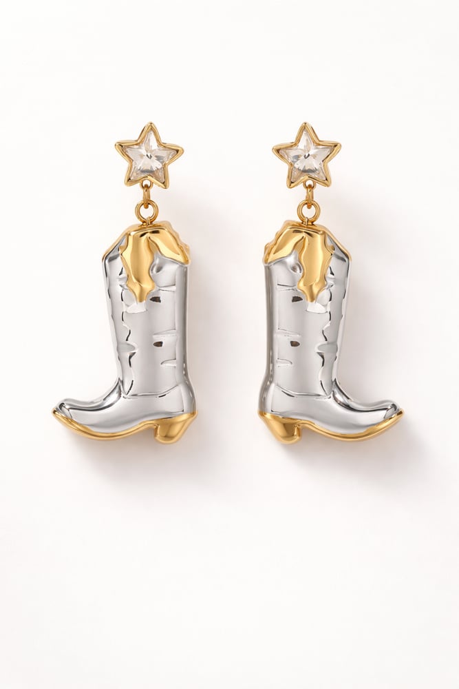 the Cowgirl Earrings are the perfect addition to any cowgirl outfit. Made with high quality materials, these earrings feature a mix of gold and silver elements, bringing a touch of cowgirl style to any look. Show off your inner cowgirl with these stunning boot shape earrings.