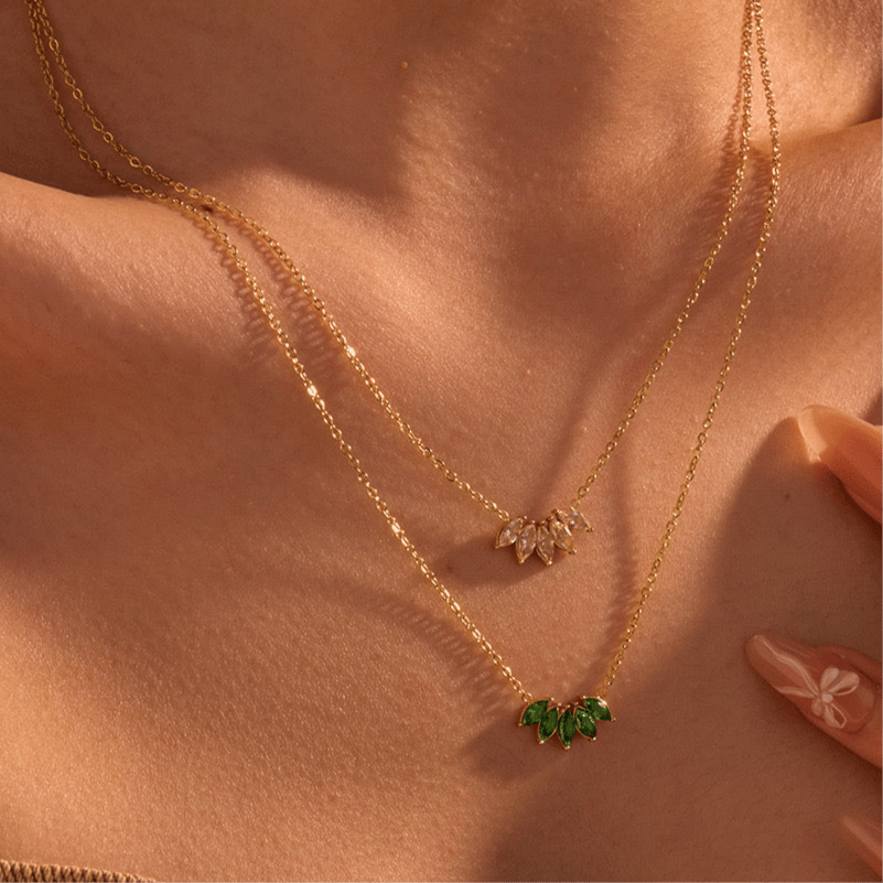 Elevate your everyday elegance with the Marquise Radiance Pendant Necklace. Featuring five marquise cut gemstones in your choice of emerald green, brilliant white cubic zirconia. This dainty gold plated necklace brings a touch of color and refined sparkle to any outfit. Perfect for layering or wearing solo.