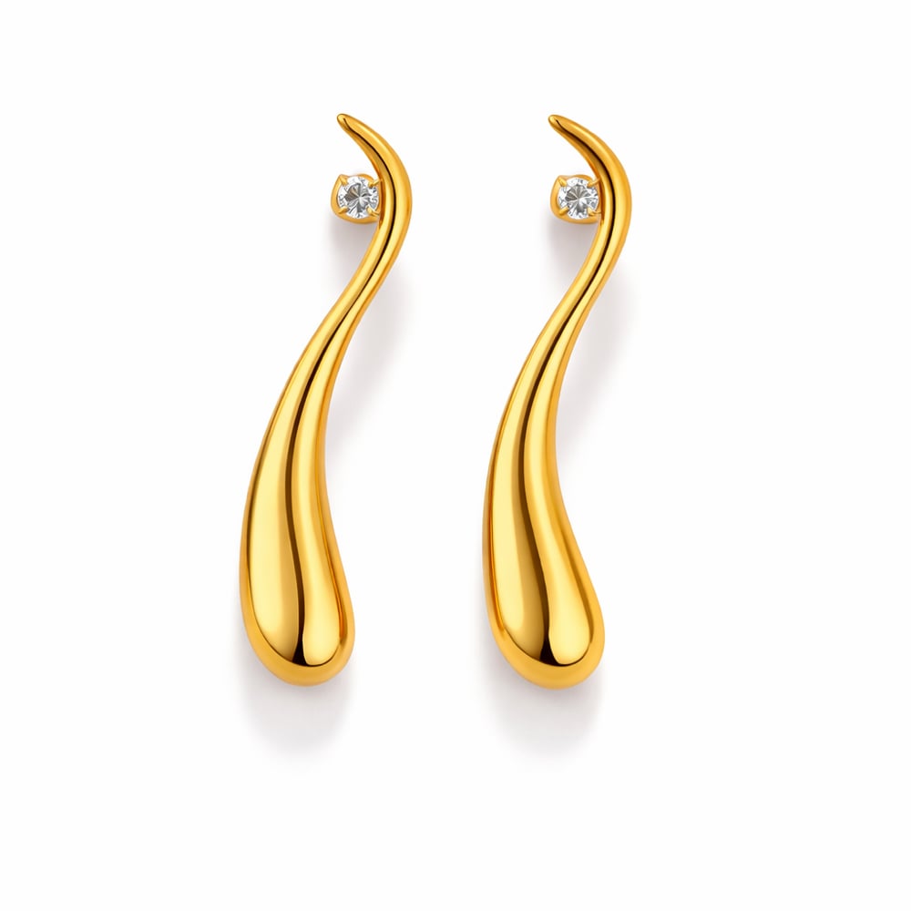 The Molten Curve earrings bring a modern twist. Designed with fluid, droplet curves and accented with a subtle crystal stud, these statement earrings evoke effortless luxury and movement. Perfect for elevating any look, day or night.