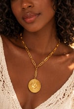A radiant statement piece designed to elevate your everyday style. The Solara Bloom Necklace features a textured sunburst medallion with a delicate floral center, with a modern gold link chain.