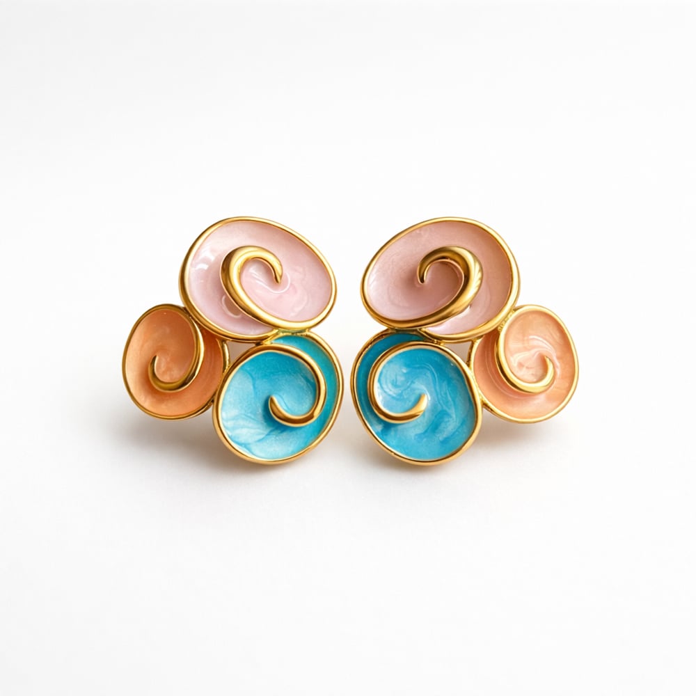 Add a burst of color and artistry to your look with the Soraya Swirl Earrings. These statement studs feature a trio of swirling spirals in dreamy pastel tones blush pink, ocean blue, and honey gold framed in a radiant gold finish. Lightweight yet bold, they’re the perfect pop for elevating your everyday or adding flair to a night out.