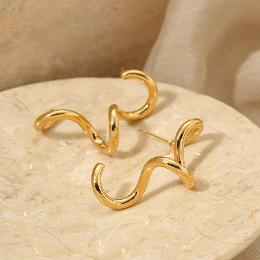 Make a bold, artistic statement with the Zaria Wave Earrings. Featuring a fluid, sculptural silhouette in high polish 16k gold-plated stainless steel, these earrings bring a modern twist to the classic dangle earrings. Their lightweight, wavy design adds a playful edge while staying minimalist and versatile perfect for elevating both everyday looks and night-out styles.